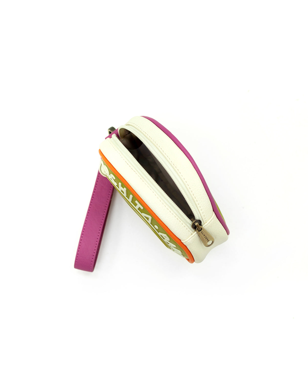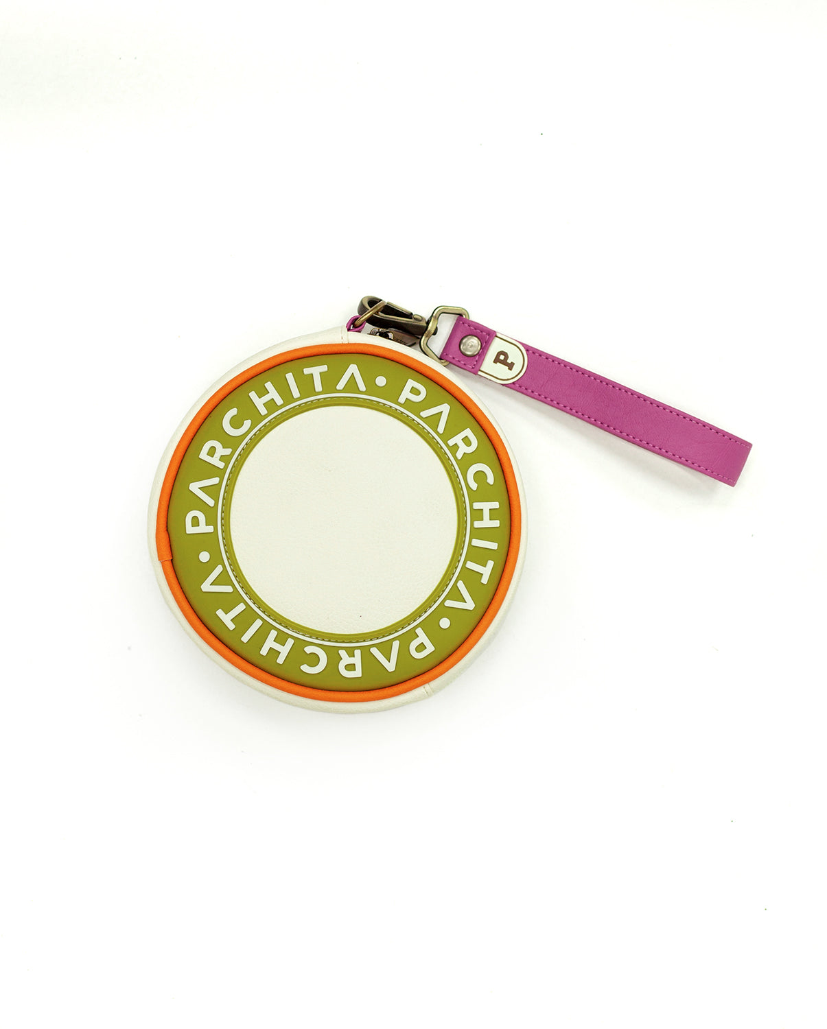 Nuestra Cosmetiquera mini disco tiene una forma circular y dinámica. El característico Parchita en relieve, herrajes pavonados y llavero son detalles que la llevan a otro nivel. Es perfecta para llevar a todos lados.